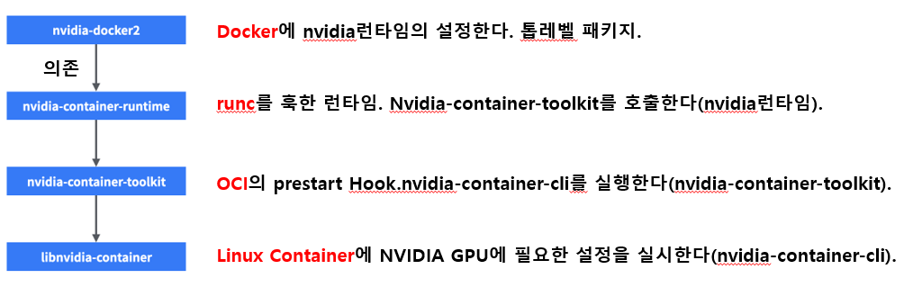 아래 패키지들의 포함을 Nvidia-Docker라고 칭하며 위에서 부터 아래로 의존하는 형태 (nvidia-docker2를 설치하면 나머지가 모두 설치됨)