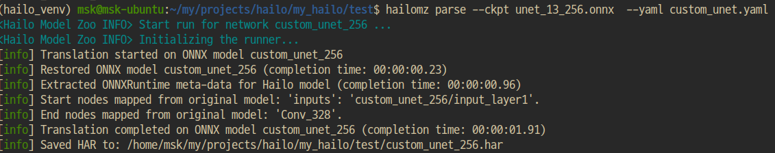 $ hailomz parse --ckpt ./unet_13_256.onnx --yaml custom_unet.yamlhailomz parse는 커스텀 모델의 아키텍처에서 start/end node를 자동으로 찾음- 찾지 못하는 경우에는