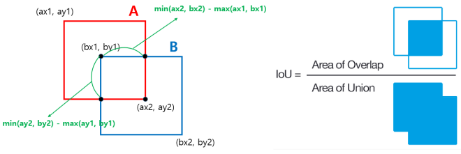 - 예측데이터의 바운딩박스와 정답데이터의 바운딩 박스의 겹치는 부분의 비율(IoU:Intersection over Union)
