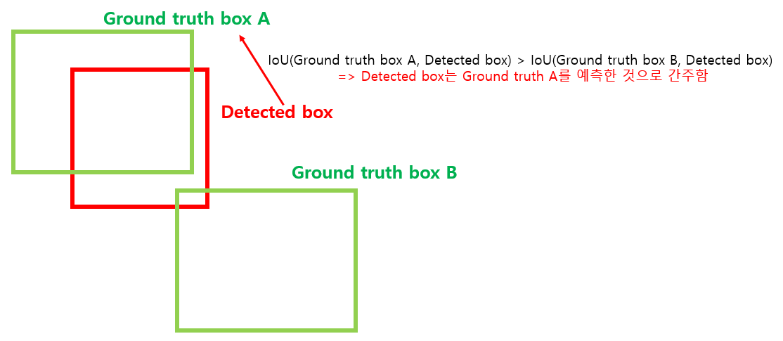 - 예측데이터를 정답데이터와 비교해 IoU 값을 바탕으로 옳바르게 객체를 탐지했는지 판단함