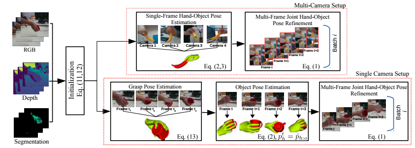 단일 카메라 셋업은 시퀀스에 따라 그랩 포즈가 조금씩 다르다는 가정하게 작동하고, 멀티 카메라 셋업은 복잡한 손+객체 상호작용 시나리오를 처리할 수 있다