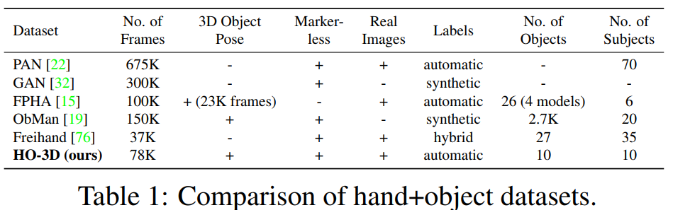 FeriHAND, 2019 는 손-객체 상호 작용을 포함하는 멀티 뷰 RGB 데이터세트를 제안하였으나, 주석은 손의 3D 포즈와 모양만 있다.