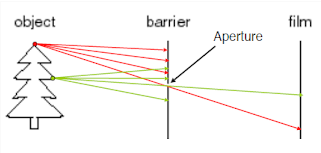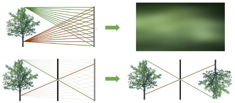 - 실제 객체로부터 나오는 빛은 난반사되기 때문에 Pinhole 이라 부르는 아주 작은 구멍을 만들어 하나의 Ray만 통화하게 만들면 상이 뒤집힌 이미지를 얻을 수 있다.