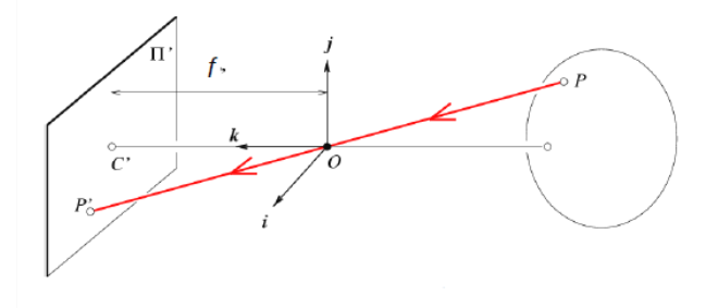 ✔ 3차원 공간에 있는 물체에 반사되어 오는 빛이 이미지 센서에 들어올 때 카메라 모델에 따라 빛의 변형이 이루어지므로 카메라 모델에 따라 계산함.