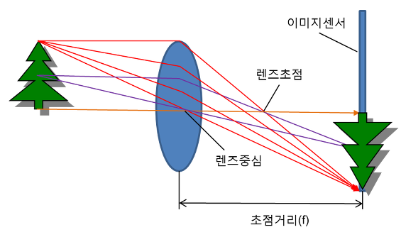 - : focal length, 이미지 평면과 렌즈 평면(빨간색 선) 사이의 거리.