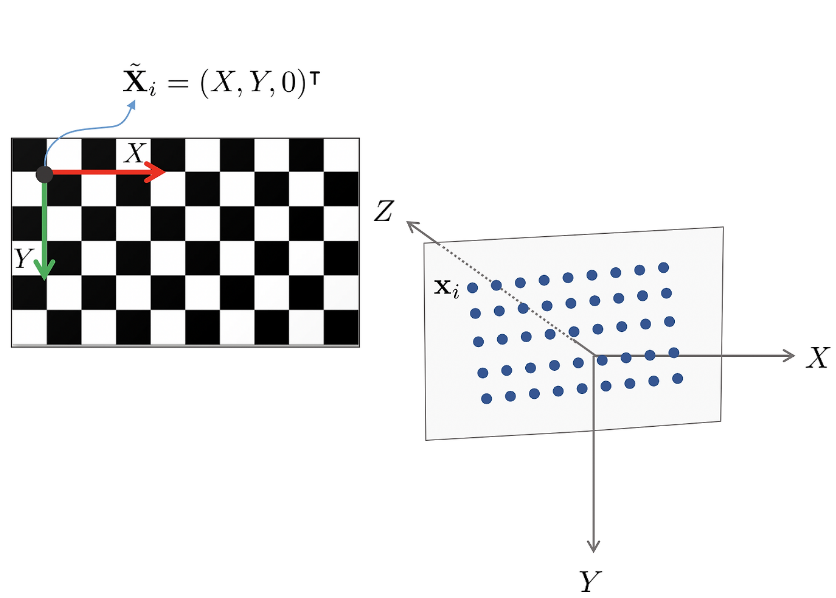 - 체커보드는 패턴의 길이와 갯수를 모두 알고 있기 때문에 체커보드 좌표 에 대응하는 이미지 좌표 을 구할 수 있다. 이때 이미지 좌표는 체커보드 Feature Extraction 알고리즘으로 쉽게 구할 수 있다.