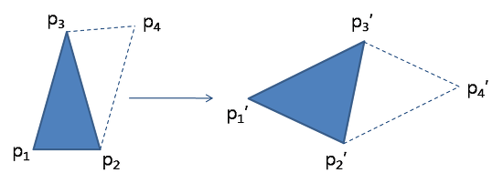 - 평행성을 보존한다는 의미는 예를 들어 위 그림과 같이 점 p1, p2, p3를 p1’, p2’, p3’으로 매핑시키는 affine 변환을 구했을 때, 이 affine 변환을 가지고 p4를 매핑시키면 p4’이 나와야 한다는 의미