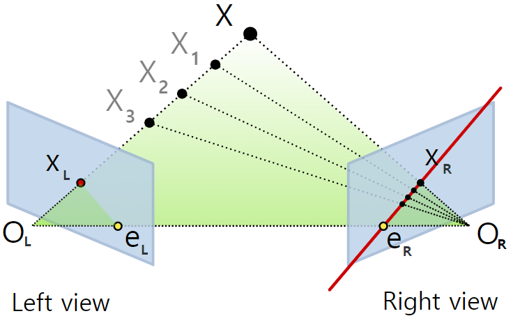 - 의 영상좌표 로부터 대응되는 의 영상좌표 을 유일하게 결정할 수는 없지만 이 지나는 직선인 epiline 은 유일하게 결정할수 있음
