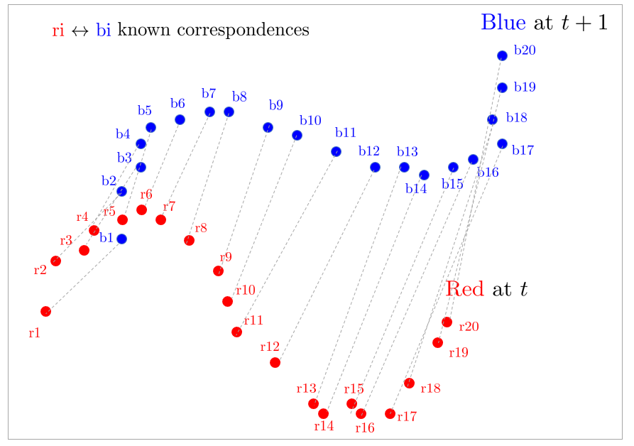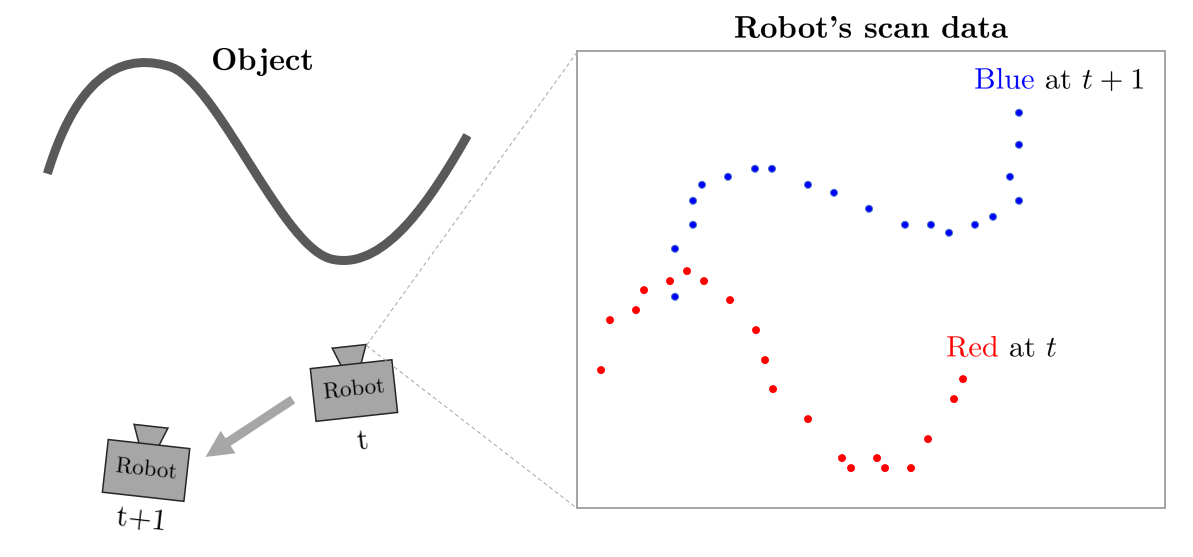 - 2D 점군 데이터를 예로 들어 로봇이 2D 스캐너 따위를 통해 다음과 같은 데이터를 , 시점에 대해 획득 하였을 때, 각 포인트 집합은 아래와 같다.