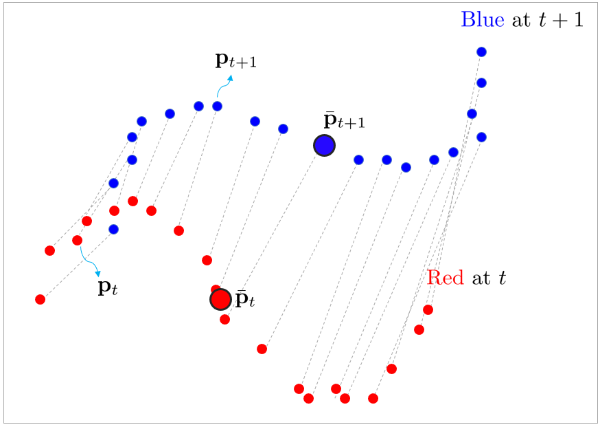 - 이 때, 두 점군의 이동 벡터는 는 시점 점군의 무게중심 과 시점 회전한 점군의 무게중심 의 차이로 설정한다.