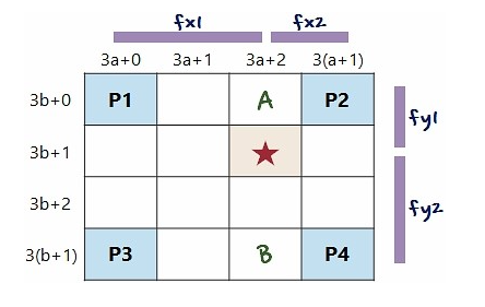 - 예시) 3배 업샘플링한 이미지에서 좌표에 해당하는 4개의 주변좌표를 구한다면,