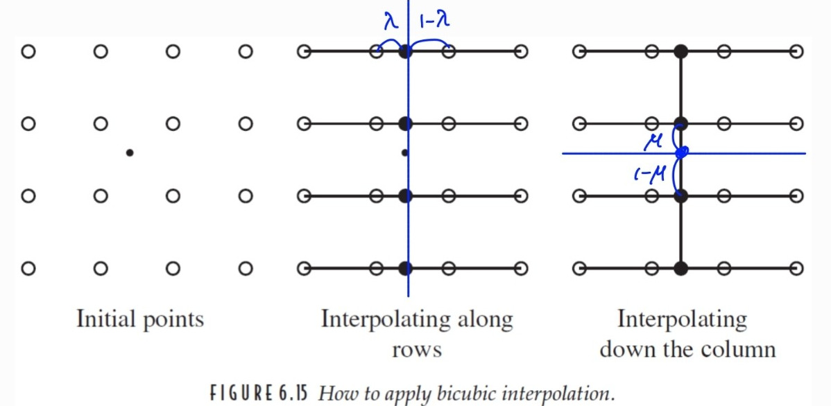 - 그 4개의 중간 값에 대해 y방향 cubic 보간 수행 → 최종 보간 값 생성