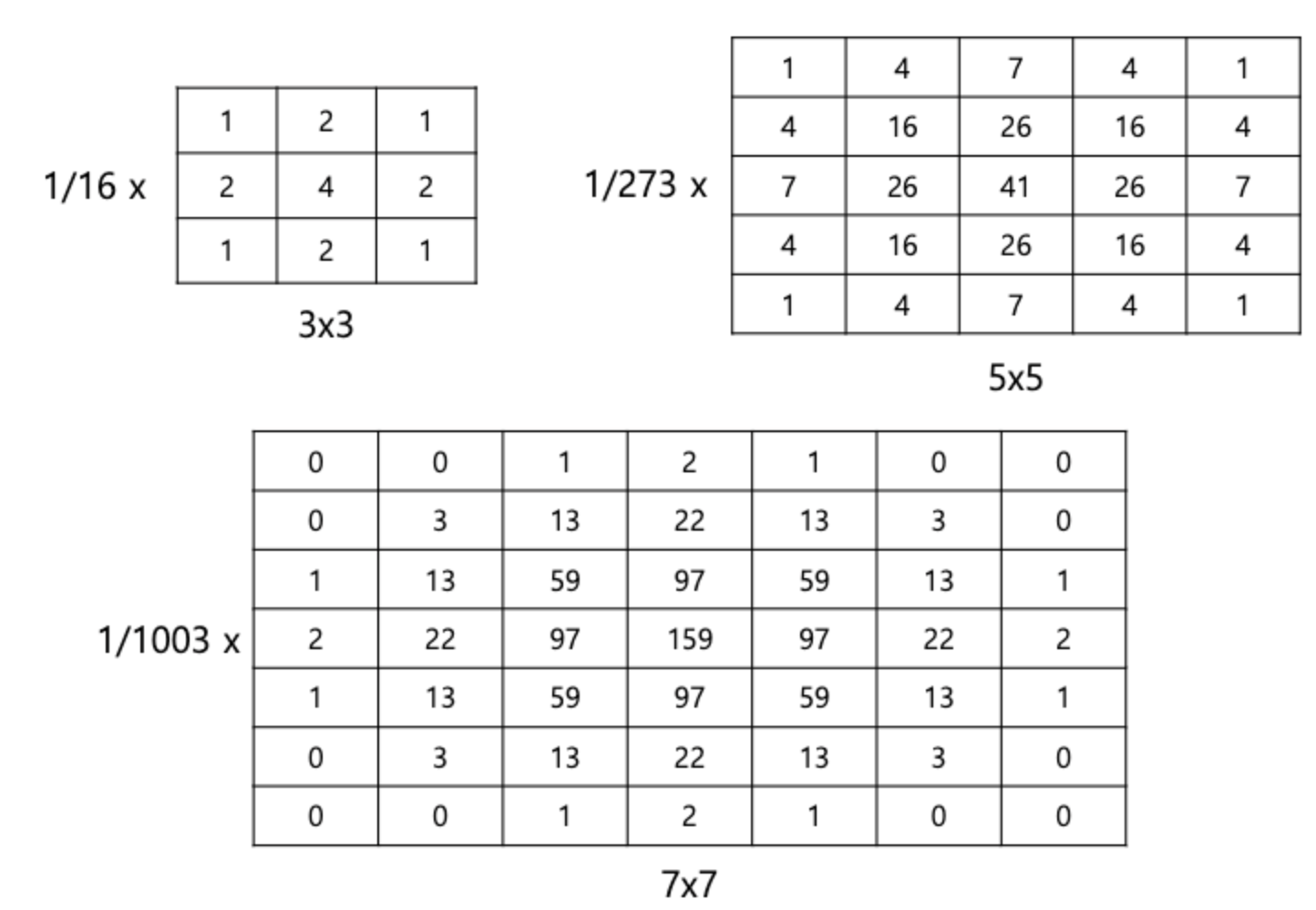 - 평균 필터와 다르게 단순히 모든 픽셀을 같은 비중으로 평균내는 것이 아니라, 중심부의 영향이 가장 크고 멀리 떨어질수록 영향이 적도록 한다.