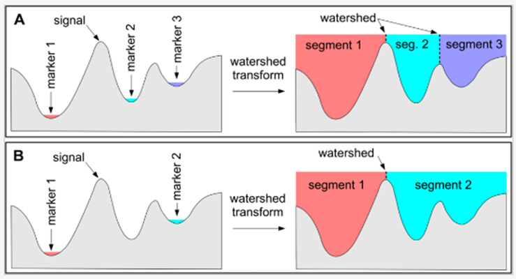 - 영상처리에서 대표적인 영역 기반 분할 (Region-based Segmentation) 방법 중 하나로, 영상을 지형(terrain)으로 해석하여 픽셀 값을 고도로 보고 낮은 값은 계곡, 높은 값은 산봉우리로 간주함.