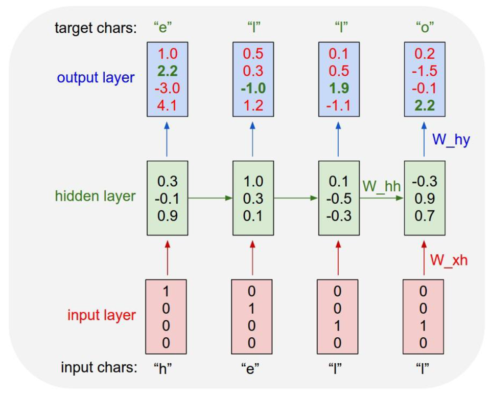 - 우학습데이터의 글자는 ‘h’, ‘e’, ‘l’, ‘o’ 네 개를 one-hot-vector로 바꾸면 각각 [1,0,0,0],[0,1,0,0],[0,0,1,0],[0,0,0,1]이 됩니다.
