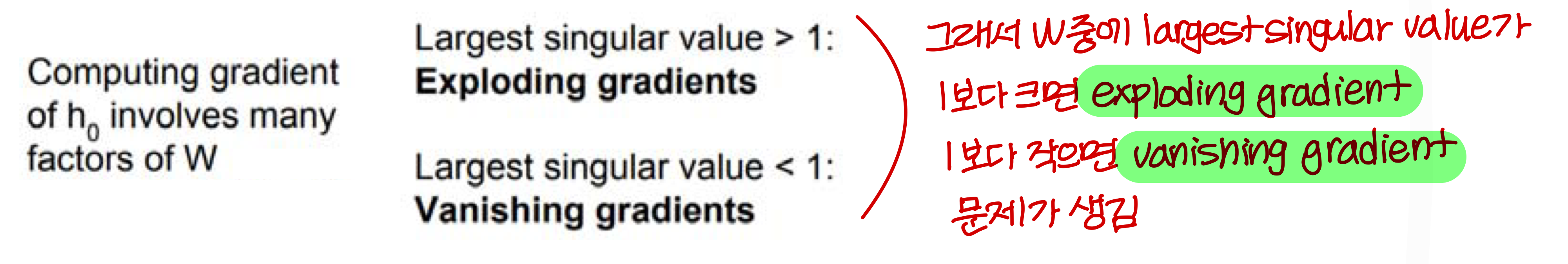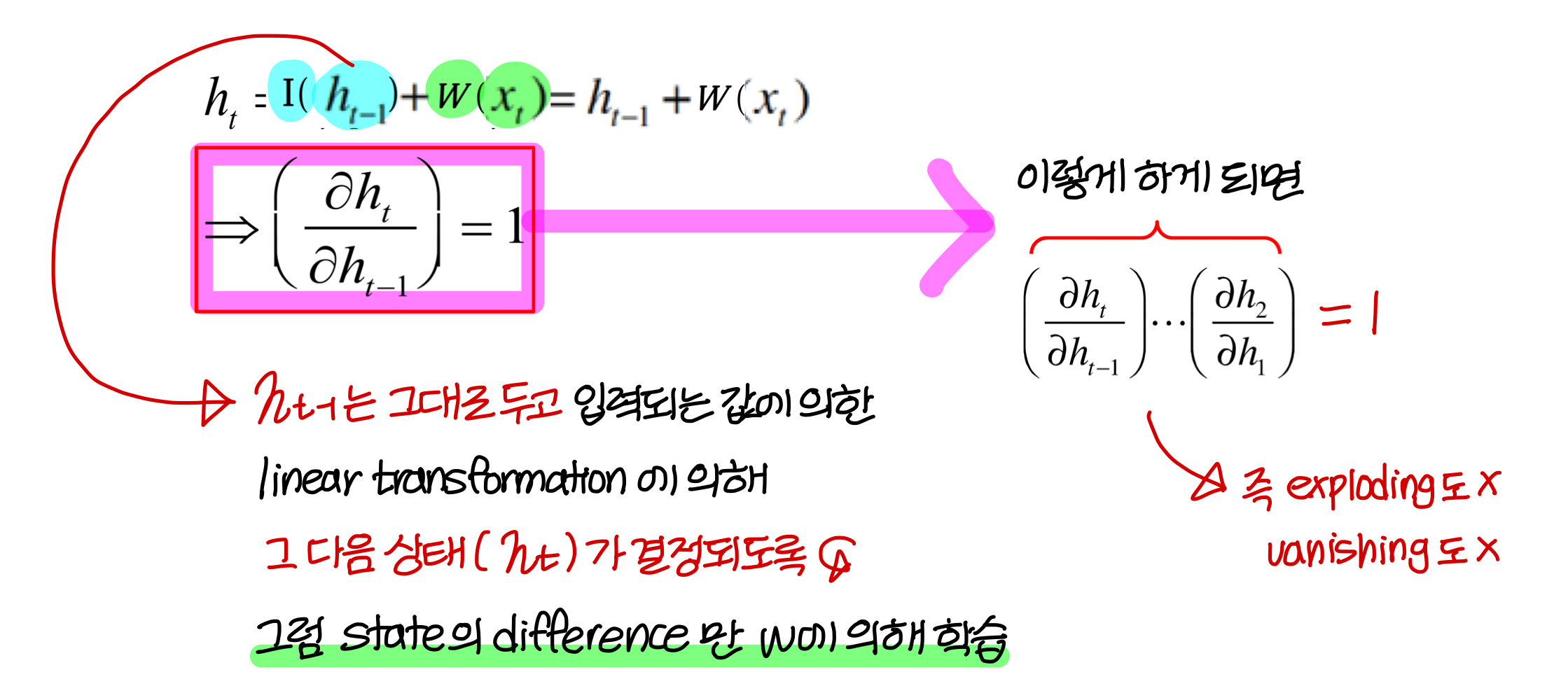 - 곱셈이 많이 이루어 지면서 값이 1보다 크거나 1보다 작은 경우 각각 Exploding과 Vanishing gradients 문제를 가짐
