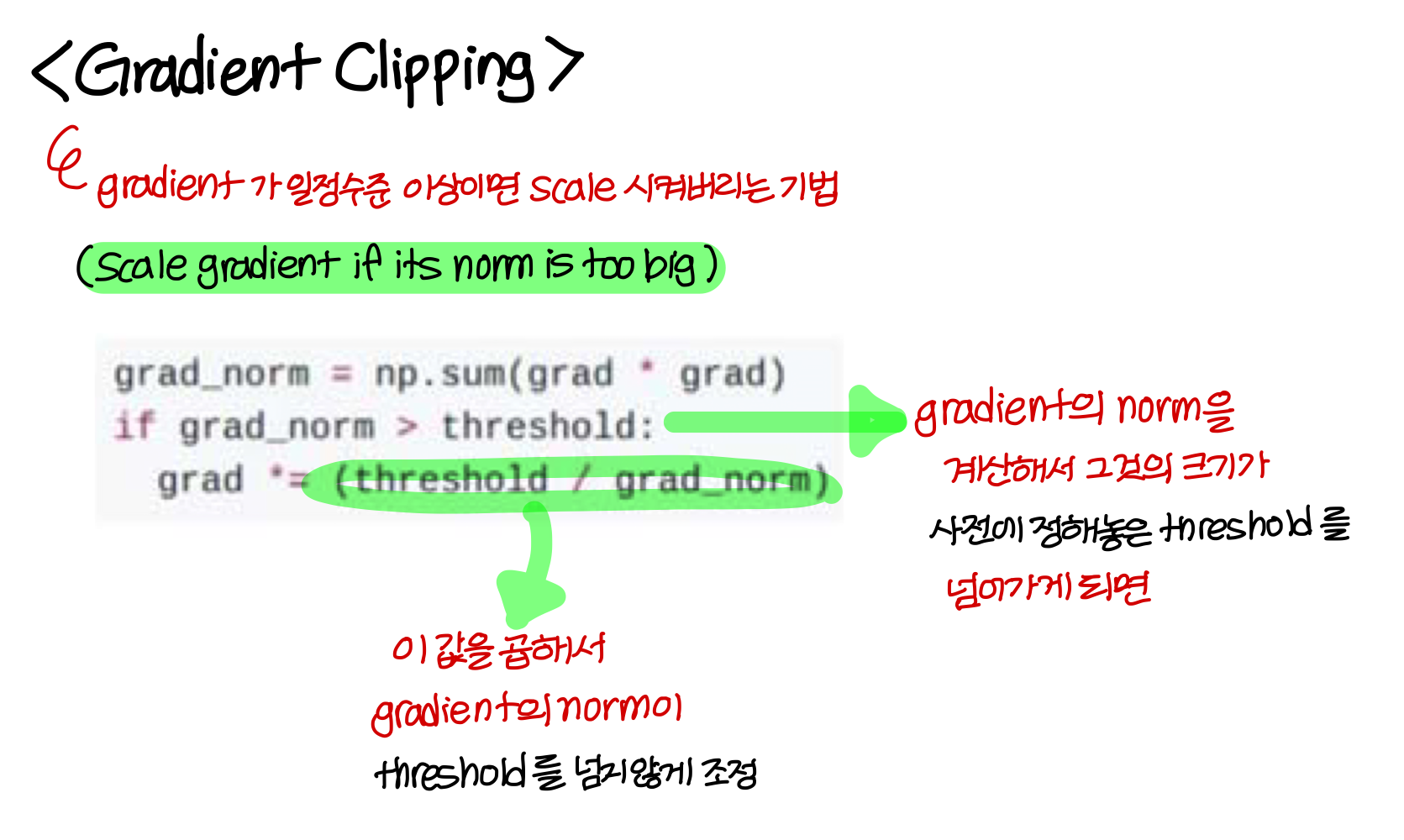 - Exploding gradients 문제는 gradient clipping 기법을 써서 해결 가능
