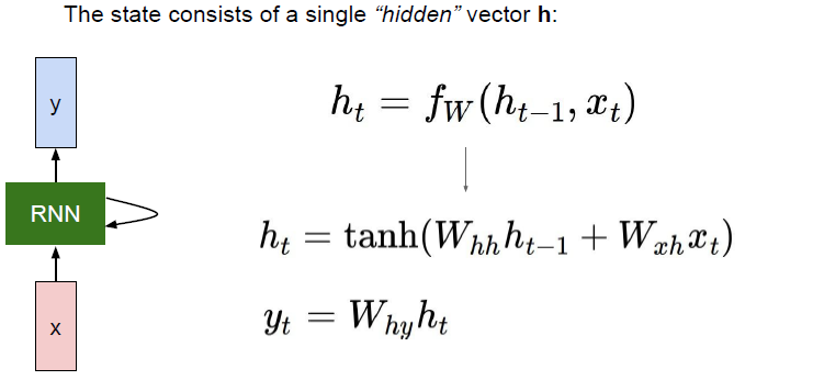 - RNN 은 라는 상태를 가지고 있으며, 아래 수식과 같은 형태로 상태가 갱신되는 구조