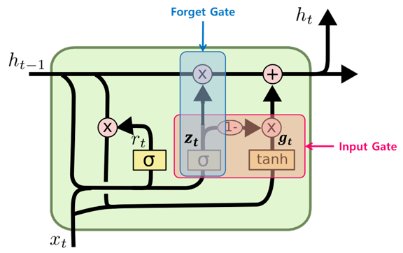 - Update를 위해 사용되던 f와 i의 값이 zt와 (1-zt)인 하나 값으로 input과 hidden state의 update 정도를 정합니다.