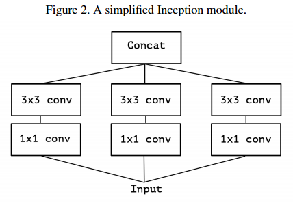 - 아래 그림은 Iception module을 단순화 한 것으로 1x1 conv 및 3x3 conv를 병렬로 처리하고 합치는 구조이다.