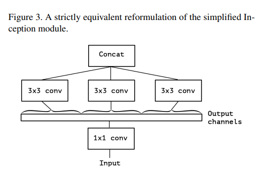 - 이때, 1x1 conv는 cross-channel correlation을 계산하고, 3x3은 spatial correlations를 수행한다. Inception 모듈이 좋은 성능을 나타내는 이유는 cross-channel correlations와 spatial correlations를 잘 분해해서 계산했기 때문이라고 해석함.
