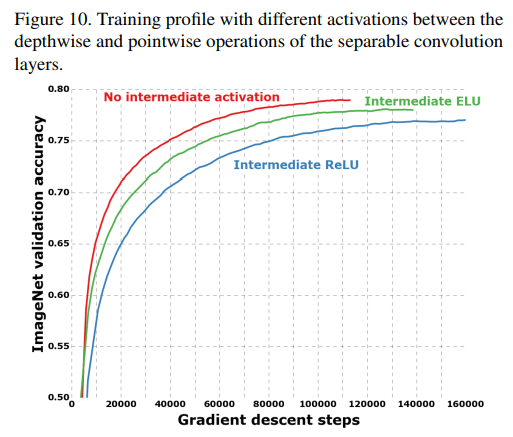 - 오리지널 Inception 모듈의 경우 pointwise/depthwise convolution을 각각 수행 후 ReLU등을 추가해 비선형성을 추가하지만, DSC를 사용하는 extreme Inception은 depthwise conv와 pointwise conv 사이에 ReLU가 없음