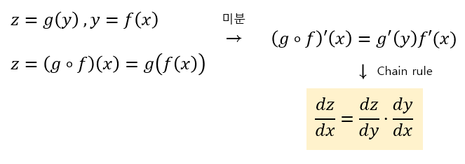 - 합성함수의 미분을 구하기 위해 chain rule 성질을 이용함