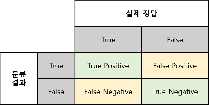 - True Negative(TN) : 실제 False인 정답을 False라고 예측 (정답)