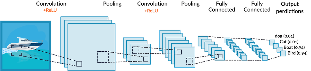 - CNN 알고리즘은 Convolution과정과 Pooling과정을 통해 진행된다. Convolution Layer와 Pooling Layer를 복합적으로 구성하여 알고리즘을 만든다.