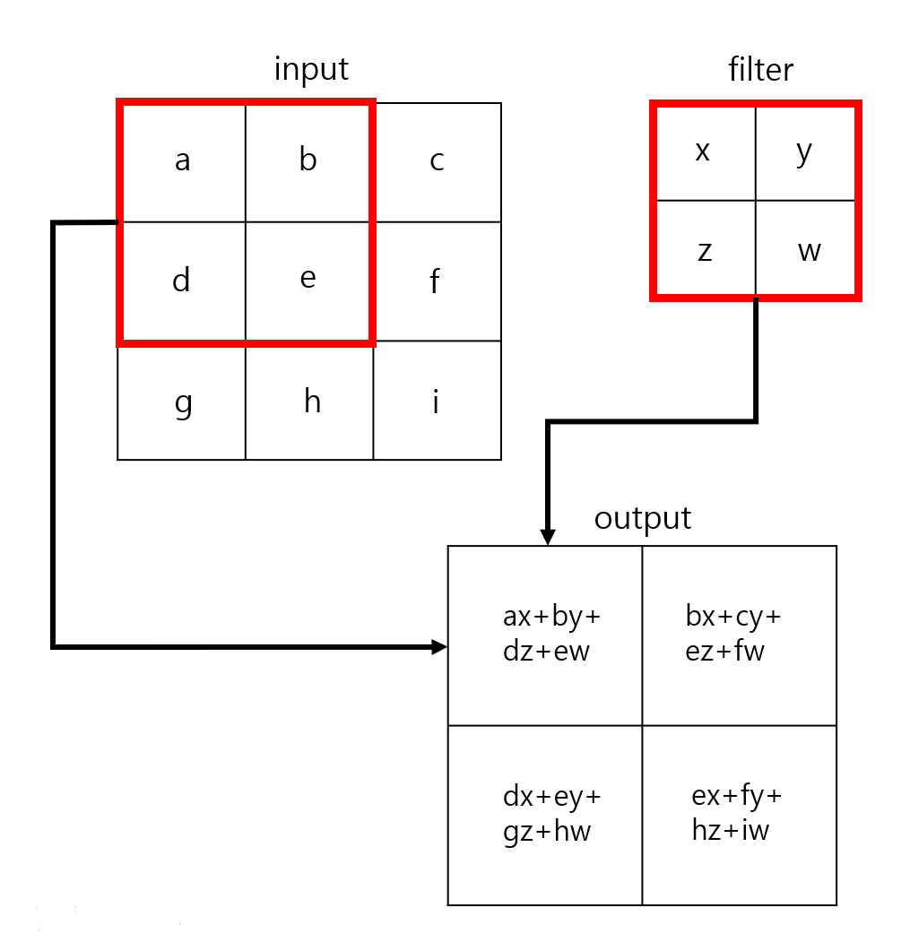 - 입력 데이터(이미지)는 kernel(혹은 filter)라고 불리는 행렬과 convolution 연산을 수행함