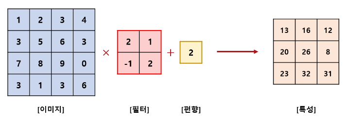 - 가중치에 편향(bias)를 더해주듯이 Convolution Layer에서도 편향을 더해주기도함