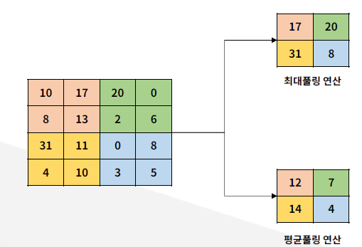 - pooling 연산은 input 이미지를 정해진 경계 만큼 격자 형태로 분할한 뒤, 해당 분할된 영역 안에서 가장 큰 값(Max-Pooling) 하나만을 선택하거나, 분할 영역 안의 요소들의 평균값(Average-Pooling)을 취한다