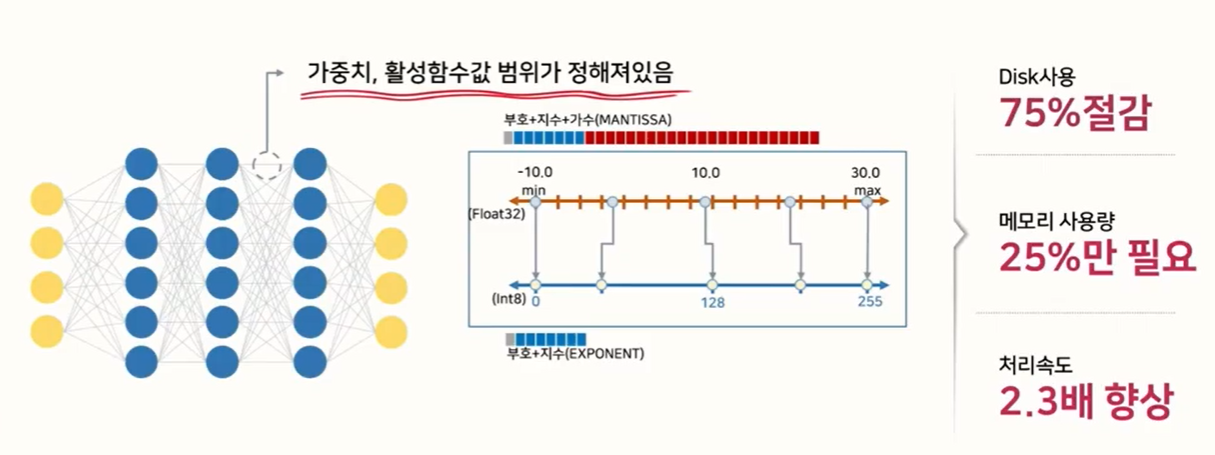 - 신경망의 가중치(weight)와 활성화 함수(activation function) 출력을 더 작은 비트 수로 표현하도록 변환하는 것