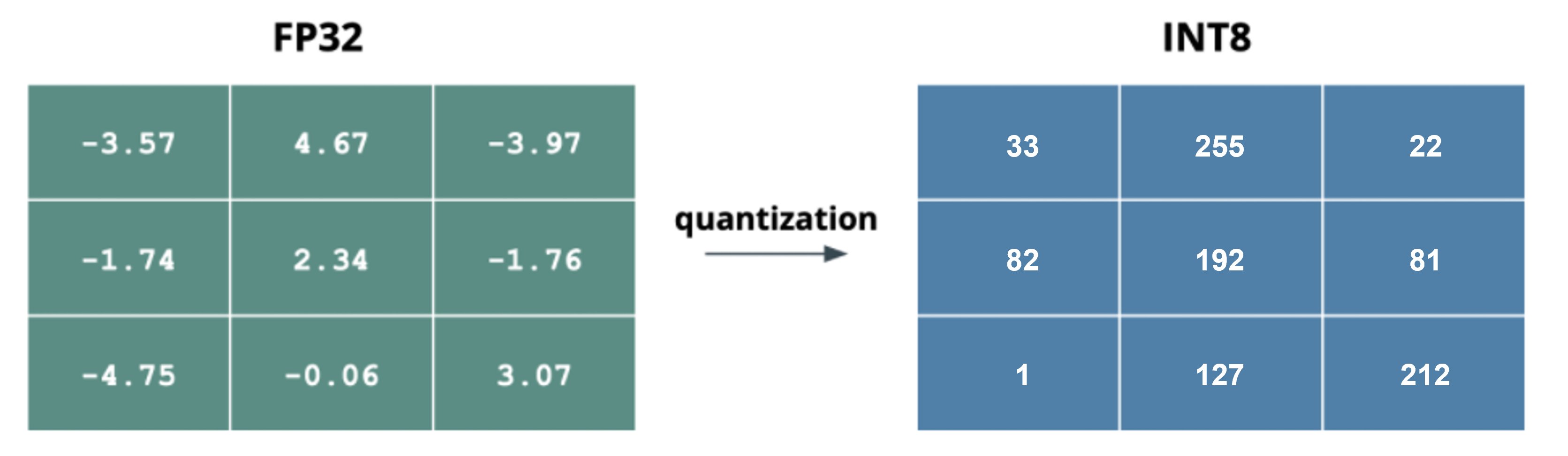 - 모델의 파라미터(fp32)를 낮은 비트(int8 등)로 표현하여 모델 크기를 줄이고 계산 비용을 낮추는 것