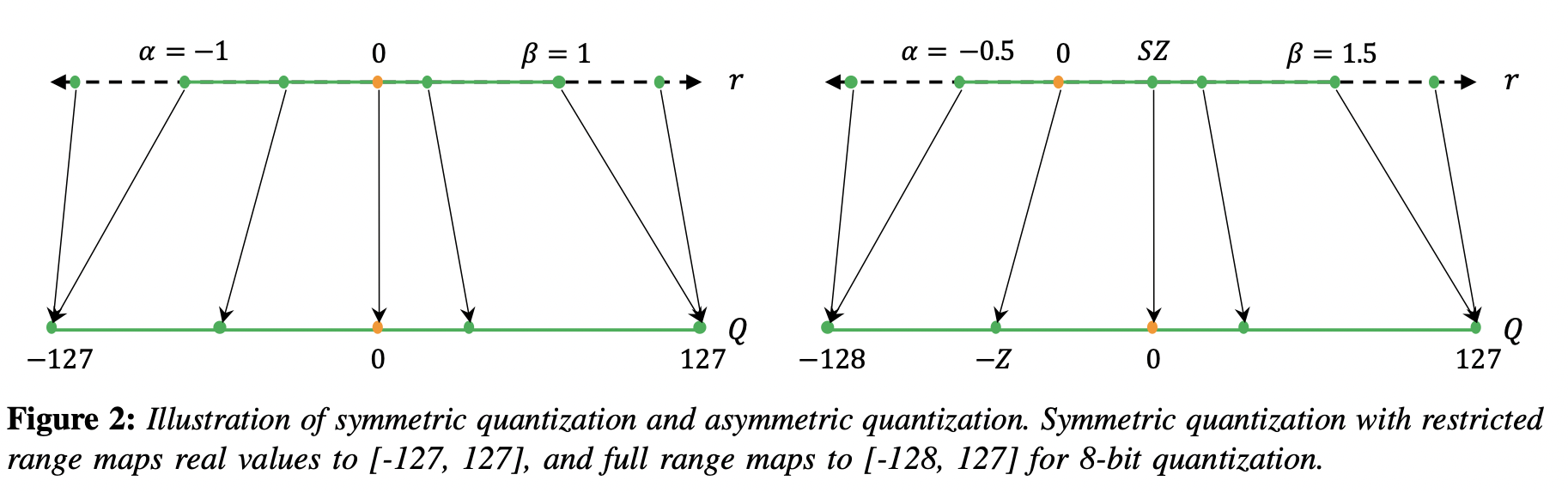 Asymmetric하게 되고,Symmetric하게 하려면 최솟값과 최댓값 중 절대값이 큰 값을 선택한 다음에 로 사용. Symmetric quantization: [−4.75, 4.75]Asymmetric quantization: [−4.75, 4.67]- 즉, Symmetric quantization을 사용할 때에는 가 되기 때문에 식 에 대입하면 다음과 같이 식이 간단해 진다.