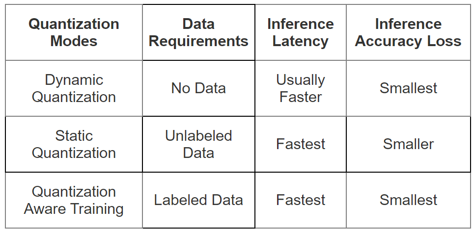 Dynamic Quantization,Static Quantization,Quantization Aware Training이 있다.