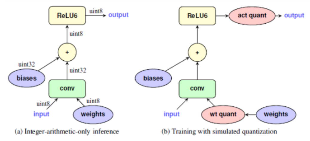 - floating point 모델에서 양자화된 정수 모델로 변환하는 동안 양자화가 발생하는 위치에 fake quantization module, 즉 quantization / dequantization 모듈을 배치하여 정수 양자화에 의해 가져오는 Clipping 및 round 에러 효과를 시뮬레이션한다.