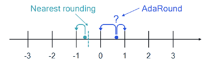 - AdaRound는 소규모 데이터를 사용해 반올림 여부를 결정하고 더 나은 양자화 성능을 위해 가중치를 조정하는 방법을 정하는 효과적이고 효율적인 방법. AdaRound는 학습 후 접근법을 취하는 (4비트 정수 등) 낮은 비트 너비로 양자화하는 데 특히 유용하다.