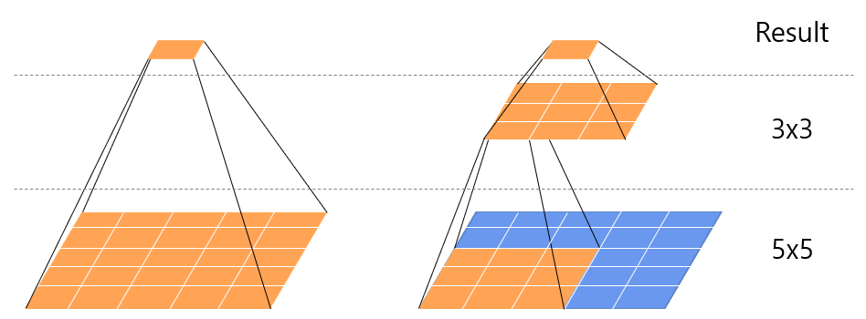- 즉, 3x3 Conv layer를 중첩하면 5x5 Conv layer를 만들 수 있으며, 더 나아가 7x7, 9x9와 같이 큰 receptive field를 갖는 Conv layer를 3x3 Conv layer의 중첩으로 만들 수 있음