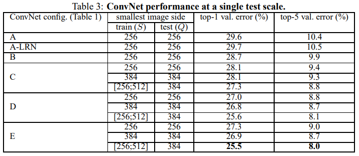 학습 시 scale jittering에 따른 성능변화를 보면 더 큰 S를 사용하는 편이 성능이 약간 좋으며, S를 하나의 고정 값으로 사용하는 single-scale 보다 multi-scale(256~512)을 사용하는 편이 더 좋은 성능이 나왔다. 이 결과로부터 학습할 때 scale jittering을 사용하는 것이 도움되는것을 알 수 있다.