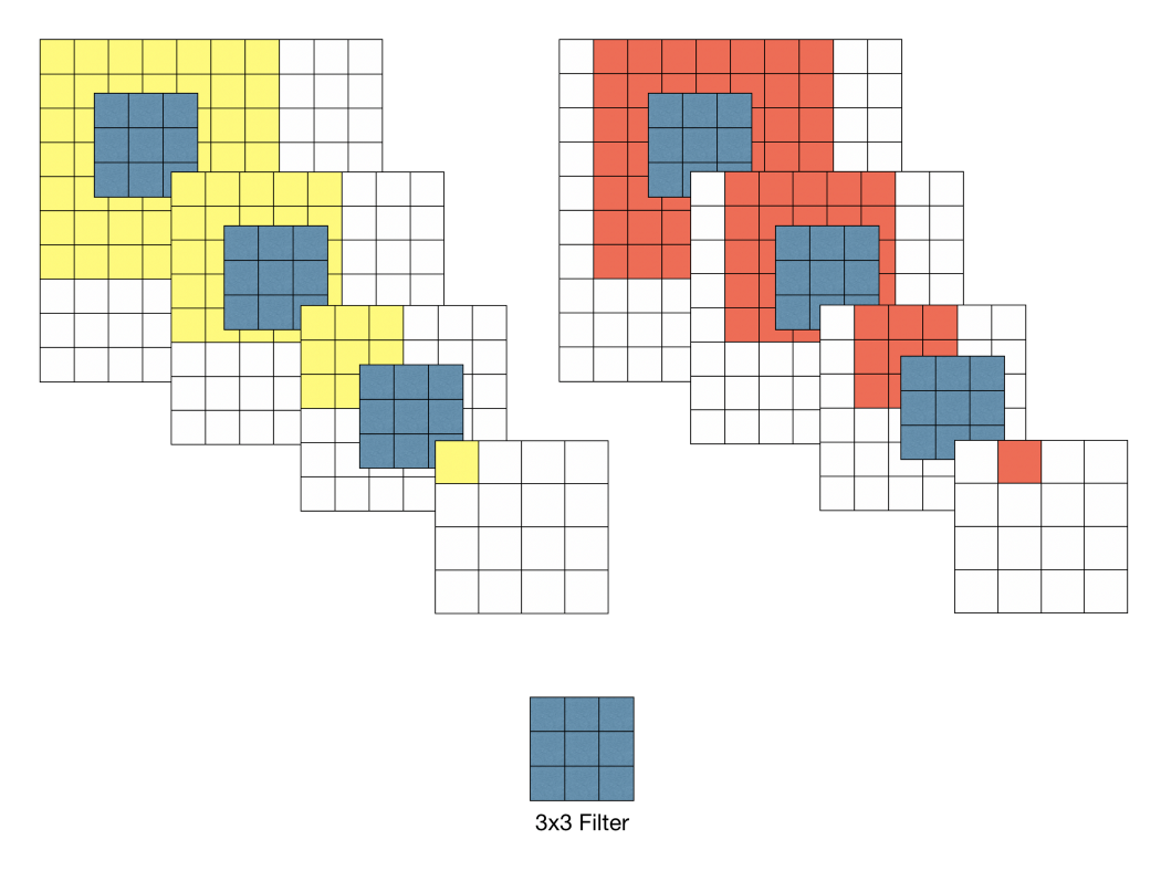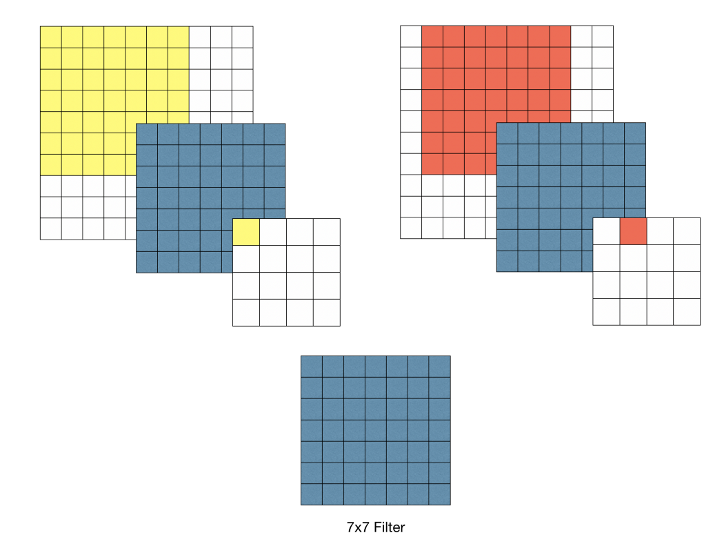 ![]() 7x7 필터의 예시로, 7x7 = 49개의 파라미터 생성 | ![]() 3x3 필터의 예시로, 3x3x3 = 27개의 파라미터 생성 |