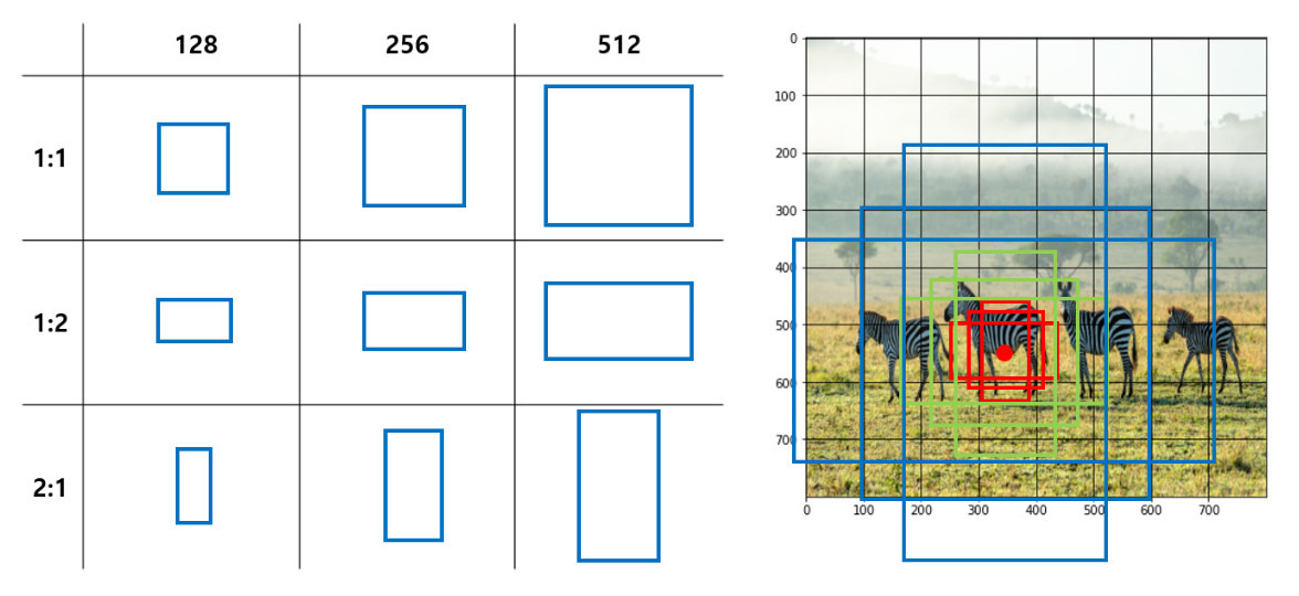 RPN은 Region proposal을 보다 정교하게 추출하기 위해 다양한 크기와 가로세로비를 가지는 bounding box인 Anchor box를 도입함.