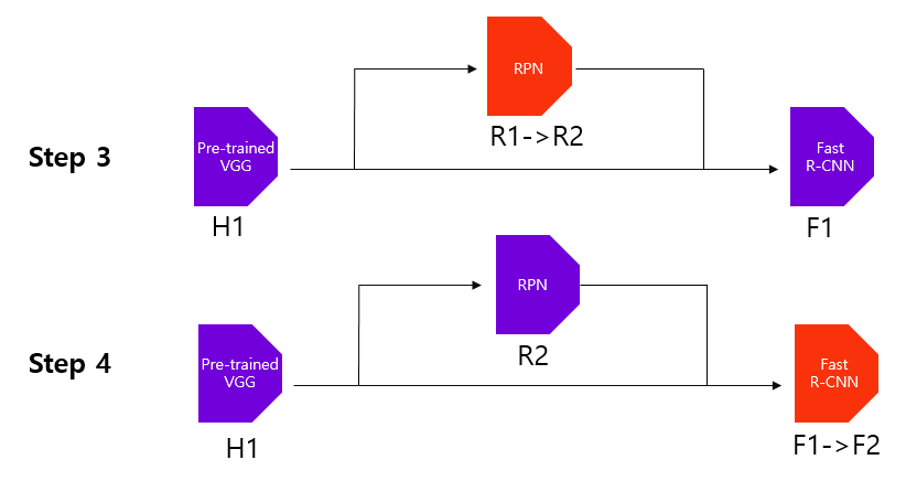 - 앞서 학습시킨 RPN과 Fast R-CNN에서 RPN에 해당하는 부분만 학습(fine tune) 시킨다.