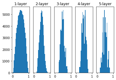 - 표준편차를 줄여 0.01로 테스트를 해보면 아래 그림과 같이 층이 깊어질 수록 출력값들이 중간 값인 0.5 부근에 몰리는 것을 확인할 수 있다.
