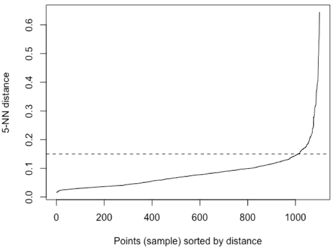 - K를 (minPts-1)로 설정하여 모든 포인트에 대한 K개의 이웃 거리값을 오름차순으로 정렬한 그래프로 그림.