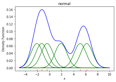 - 아래 그림에서 초록 선은 개별 관측 데이터에 가우시안 커널 함수를 적용한 것이고, 파란 선은 적용 값을 모두 더한 KDE 결과이다.