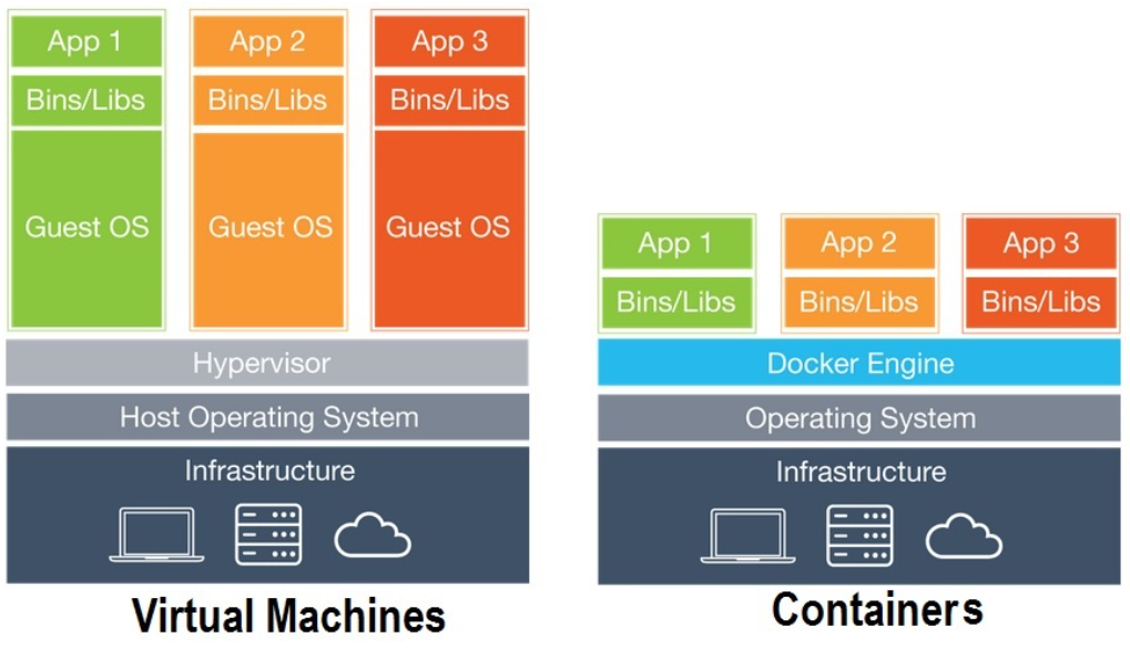 가상머신(Virtual Machine)은 하이퍼바이저를 이용해 여러개의 운영체제를 하나의 호스트에서 생성해서 사용하는 방식- 가상 운영체제는 완전히 독립된 공간과 시스템 자원을 할당받아 사용하며 대표적으로 VirtualBox, VMware 등이 있음