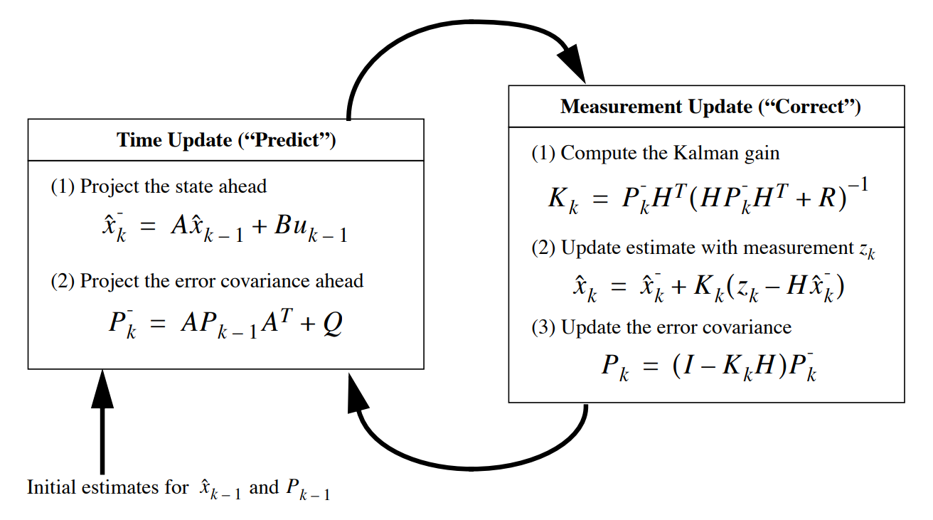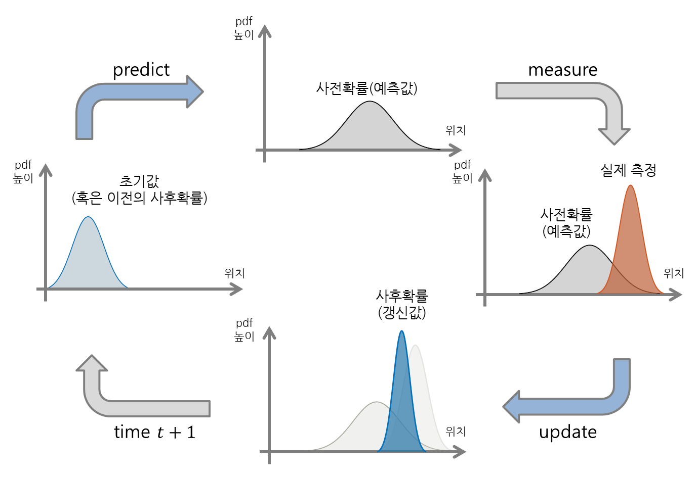 - 칼만 필터는 크게 다음과 같은 구성 요소로 이루어져 있다.