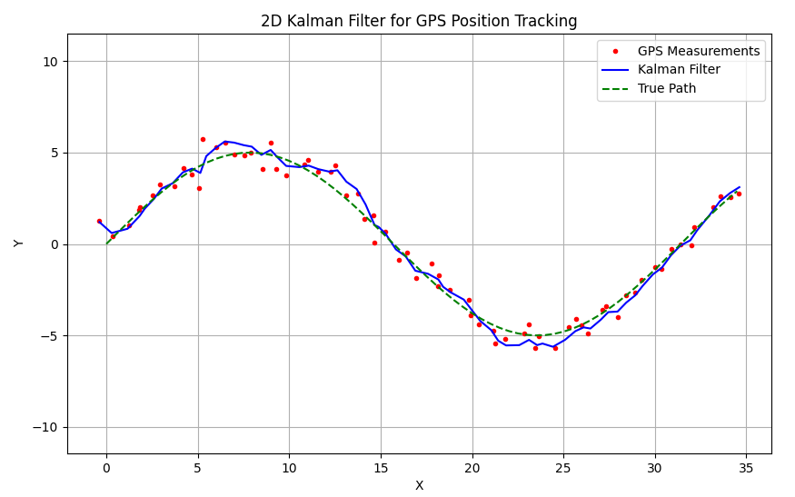 - GPS는 일정 간격으로 노이즈를 포함한 위치 관측값을 제공함.